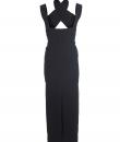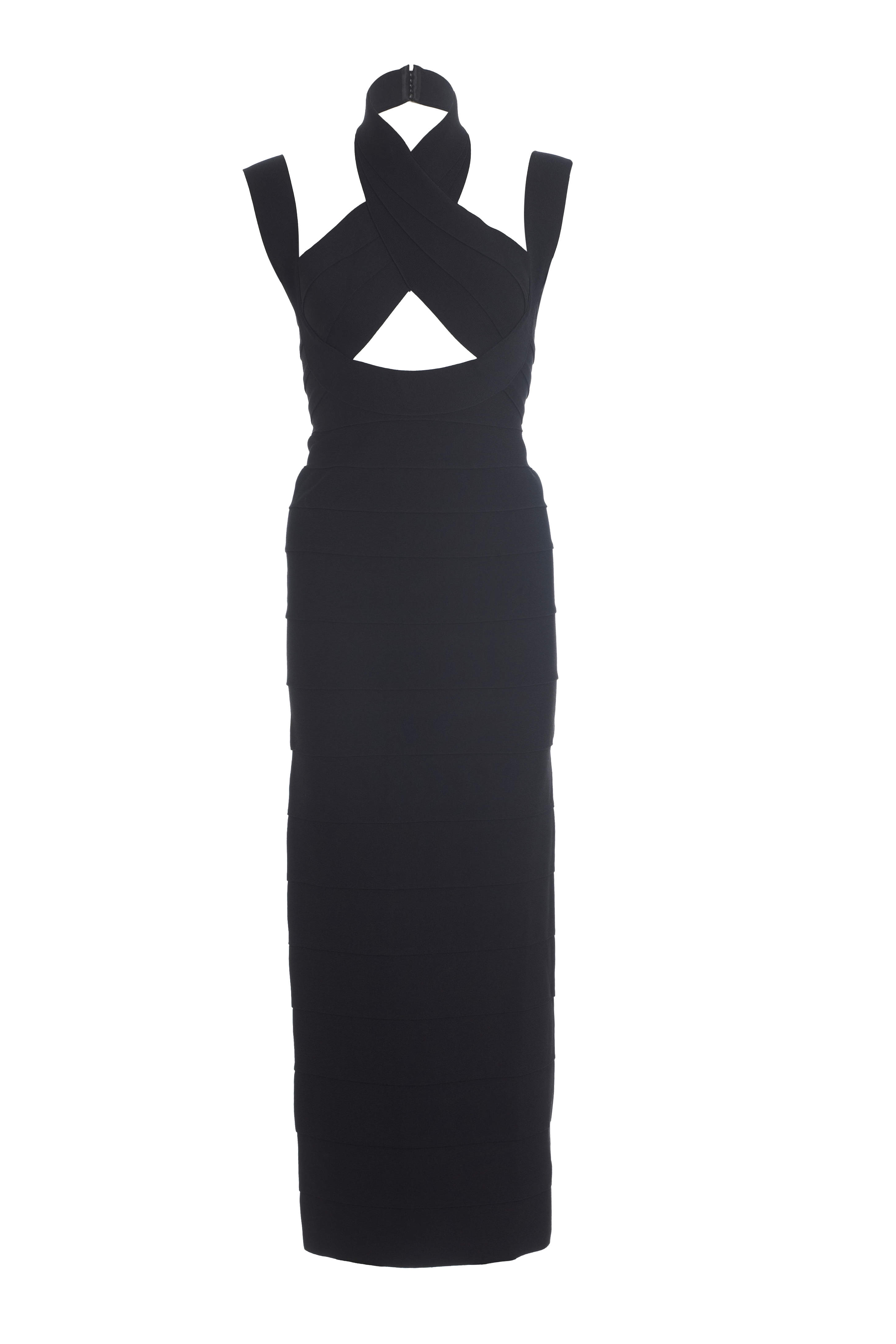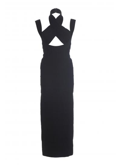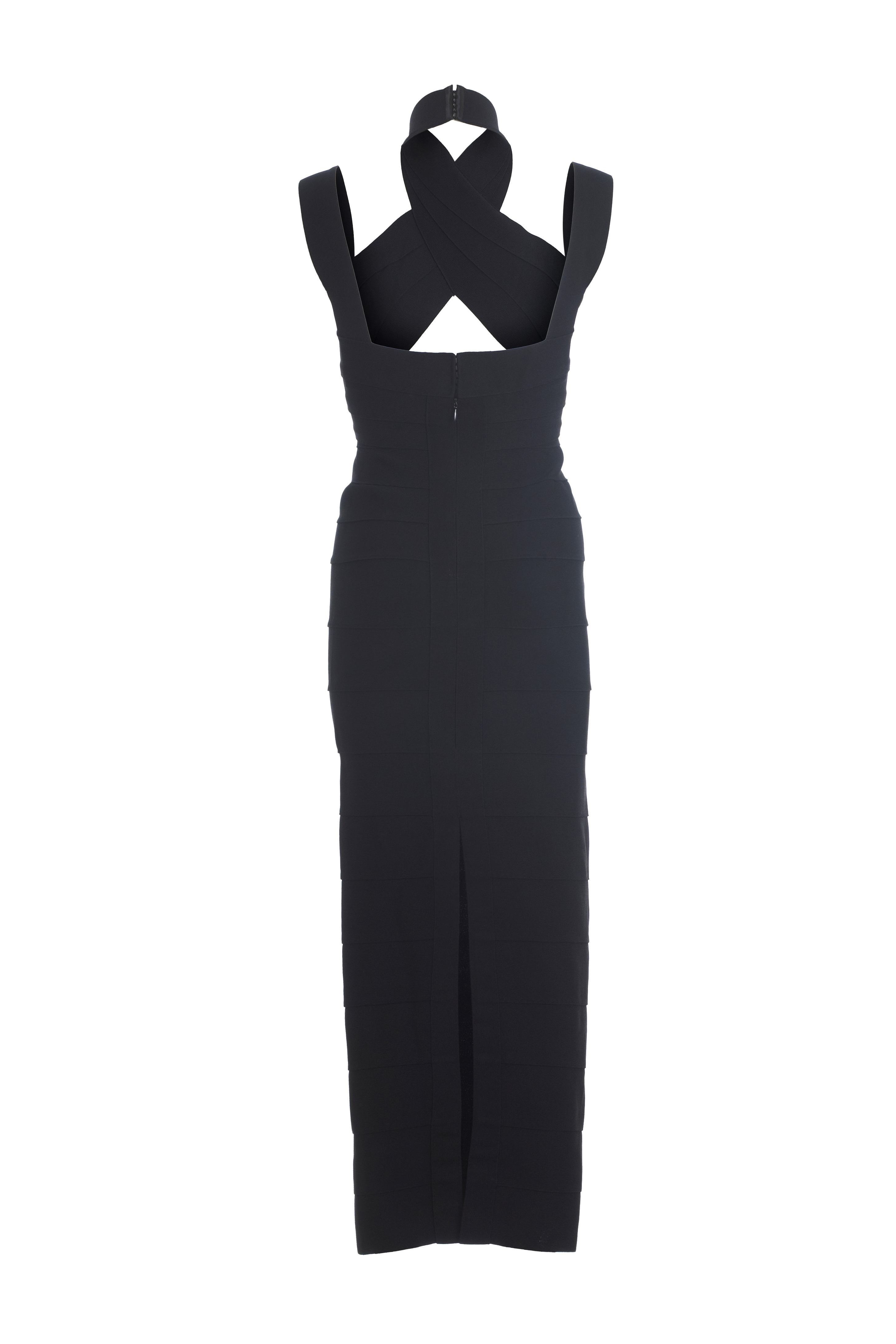 Herve Leger Couture black classic bandage dress. Panel dress with cross straps on front. Halter neck and shoulder straps. Zipper back. Slit up the back. Early 1990's.